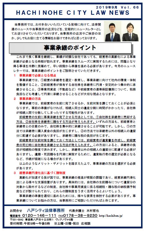 これまで長く事業を継続し、業績が好調な会社であっても、経営者の高齢化による事業承継が必要となる時期が訪れます。事業承継をスムーズに実現するためには、問題となり得る事項を冷静に見極めて、早い段階から準備を進める必要があります。今月のニュースレターでは、事業承継のポイントをご説明させていただきます。