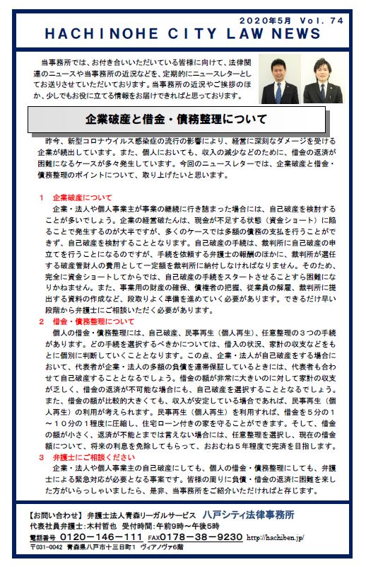 昨今、新型コロナウイルス感染症の流行の影響により、経営に深刻なダメージを受ける企業が続出しています。また、個人においても、収入の減少などのために、借金の返済が困難になるケースが多々発生しています。今回のニュースレターでは、企業破産と借金・債務整理のポイントについて、取り上げたいと思います。