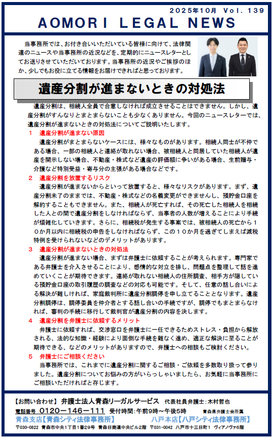 遺産分割は、相続人全員で合意しなければ成立させることはできません。しかし、遺産分割がすんなりとまとまらないことも少なくありません。今回のニュースレターでは、遺産分割が進まないときの対処法についてご説明いたします。