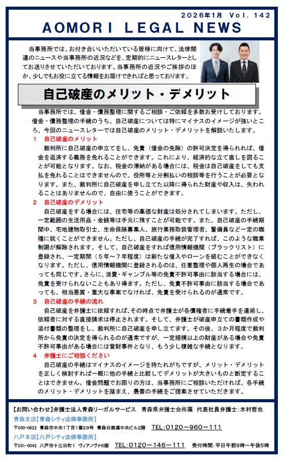 当事務所では、借金・債務整理に関するご相談・ご依頼を多数お受けしております。借金・債務整理の手続のうち、自己破産については特にマイナスのイメージが強いところ、今回のニュースレターでは自己破産のメリット・デメリットを解説いたします。