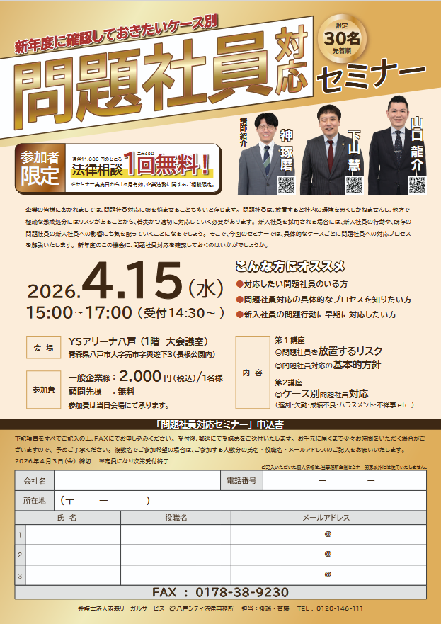 「問題社員対応セミナー」開催のご案内